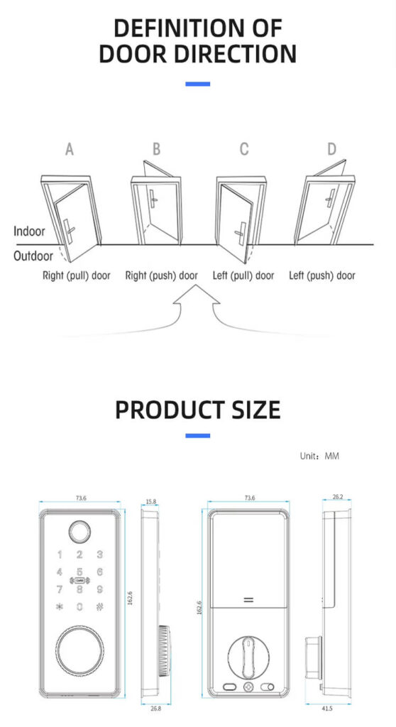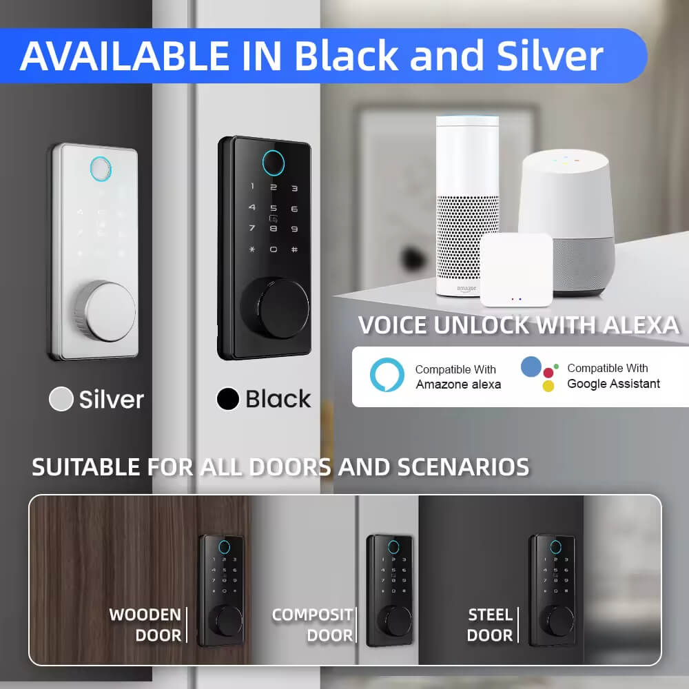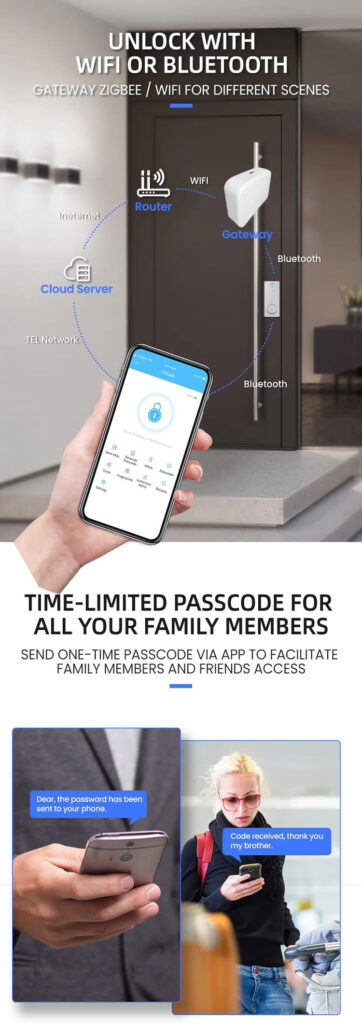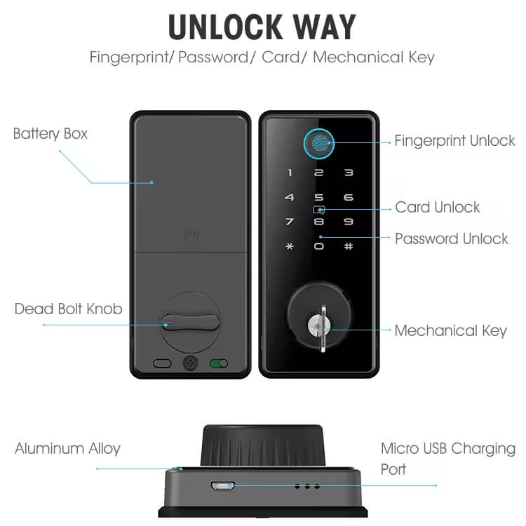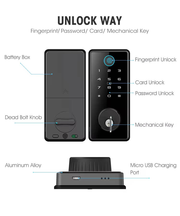 1. 6 ways to unlock: TTLOCK BLE APP, Fingerprint, Pass Code, Card, Mechanical Key Unlock;