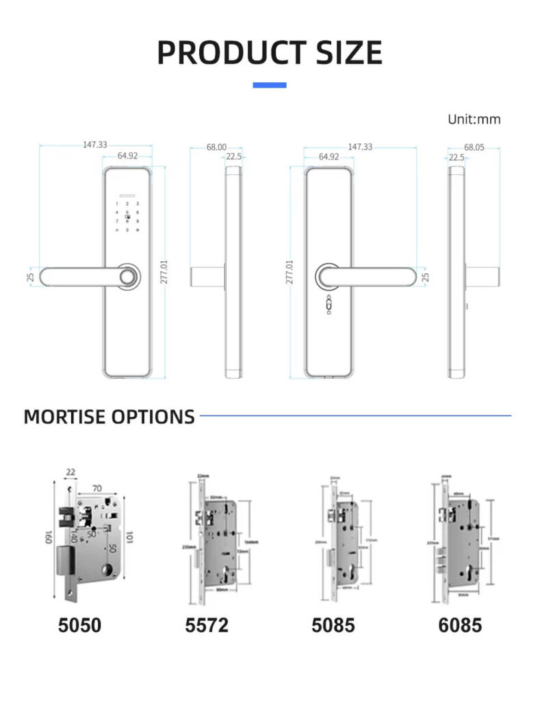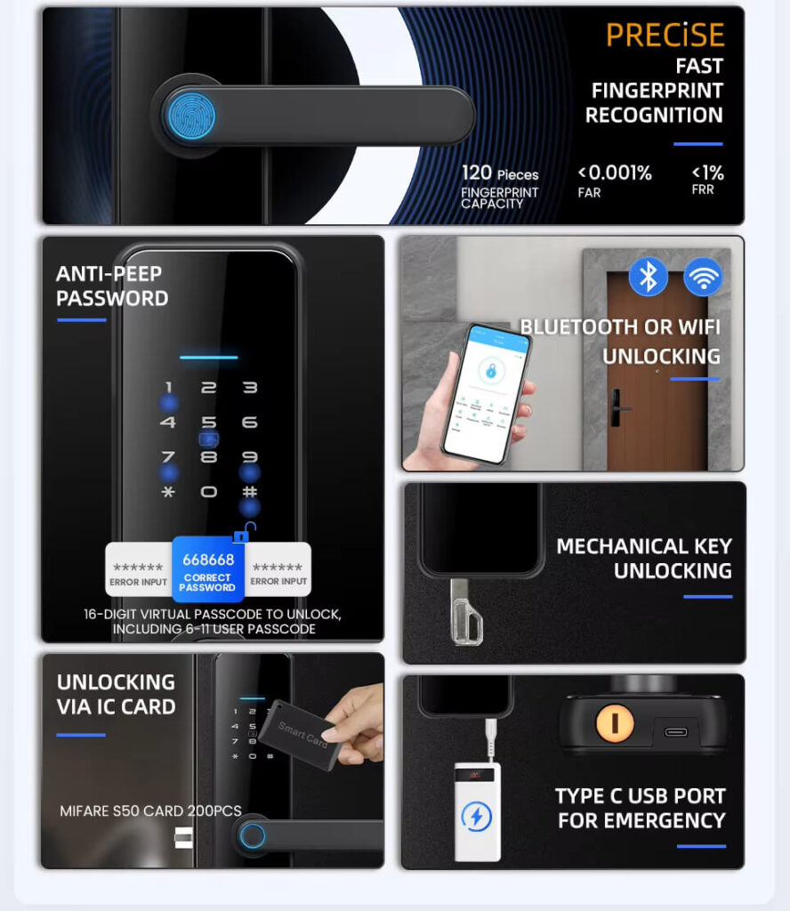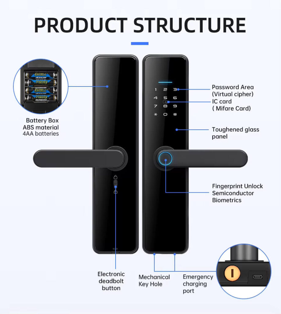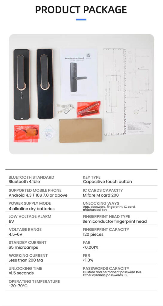 3D ngerprint sensor- Hold the handle and press the ngerprint to unlock it. 100 fingerprints can identify you in less than 1 to 1.5 seconds, and is ideal for children and the elderly.